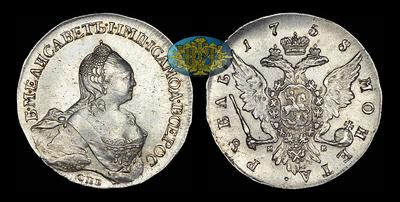 Рубль 1758 года, СПБ-ТI-НК С нитками жемчуга под короной