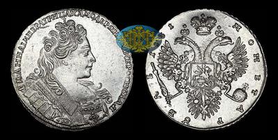 Кадашевский монетный двор. С брошью на груди. Голова меньше. 7 жемчужин на груди. 12 трилистников в ленте на плече. Легенда реверса ничем не разделена. Крест державы простой. Орел с языками.