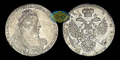 Рубль 1734 года Кадашевский монетный двор. Портрет образца предыдущих лет. 9 трилистников в ленте на плече, 4 в нижней ленте. Розетки в цепи знака Ордена.