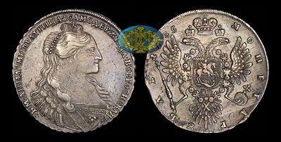 Рубль 1735 года Кадашевский монетный двор. 8 жемчужин в волосах, 11 на груди. Двоеточие в начале легенды аверса. Хвост орла острый.