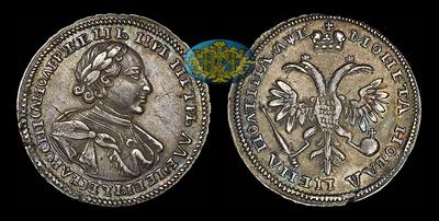 Тип 1720 года (портрет в латах и мантии). Кадашевский монетный двор. С пряжкой на плаще. Плащ подбит мехом. Без розетки на плече. С арабесками на груди.