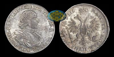 Рубль 1718 года, ОК-L Кадашевский монетный двор. Без арабесок на груди. С ошибкой в легенде аверса "росNI". "мАнета" в легенде реверса. L на хвосте орла.