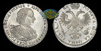 Рубль 1721 года, К Кадашевский монетный двор. Над головой украшенный четырехлистник.