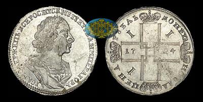 Рубль 1724 года, без букв Портрет в античном плаще - погрудный портрет (т.н. "Матрос"). Красный монетный двор. Без знака гравера.