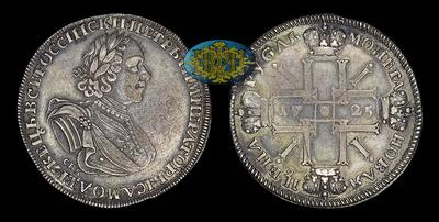 Рубль 1725 года, СПБ "Солнечник". Без наплечников. "СПБ" под бюстом. Венок с лентами. Над головой звезда.