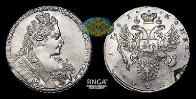 Аверс: Портрет 1731-1733 годов. Голова малая. Корона большая. Локон за ухом. Лента на плече украшена трилистниками. Без заклепок в фестонах. Лента на груди украшена тремя большими и четырьмя средними камнями. Лента внизу украшена трилистниками. Брошь на груди.