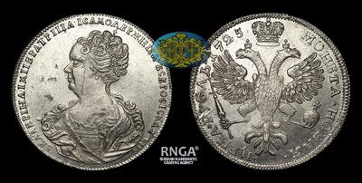 Реверс: Орел большой. Центральная корона большая, открытая, нижняя черта с окружностью. Малые короны с крестами. Головы орла с языками. Одиннадцать перьев на правом и десять перьев на левом крыльях орла. Ости между перьев на крыльях. Скипетр с крестом, касается крыла. Крест на державе большой, не касается крыла. Хвост орла широкий, нижние перья отведены в стороны. Хвост не разделяет круговую надпись. Два трилистника под хвостом. Трилистники разделяют круговую надпись. “Ц” в “ЦЕНА” с длинным хвостиком. “.РУБЛЬ”.
