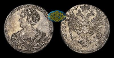 Аверс: Портрет 1725-1726 годов, т.н. «Петербургский». Голова большая, влево. Бюст широкий, разделяет круговую надпись. Наплечники на рукаве. Звезда ордена на груди. Точки в начале и в конце круговой надписи. Точки разделяют круговую надпись. «Ц» в «IМПЕРАТРIЦА» с коротким хвостиком. «Ц» в «САМОДЕРЖИЦА» с коротким хвостиком.