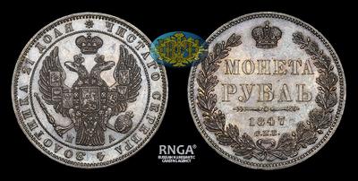 Аверс: Орел 1847, 1848, 1852 годов. Центральная корона большая. Св. Георгий в плаще. Хвост орла прямой.