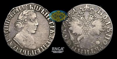 Аверс: Портрет 1703-1704 годов. Голова больше. Без заклепок на воротнике. Без заклепок на рукаве. Рукав закрытый.