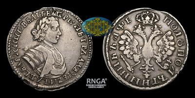 Аверс: Портрет 1705 года. Голова малая, не разделяет круговую надпись. Бюст уже. Венок без лент. Заклепки на воротнике. Заклепки на груди.