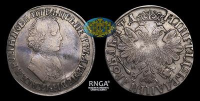 Аверс: Ничего над головой. Портрет 1704-1705 года. Голова большая. Бюст шире. Без разметочной точки на портрете.