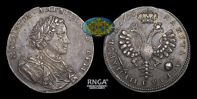 Реверс: Орел 1710 года, меньше. Центральная корона т.н. «императорская», большая, разделяет круговую надпись. Ости между перьев на крыльях орла. Крест на державе большой. Хвост орла узкий. Цифры даты сближены.