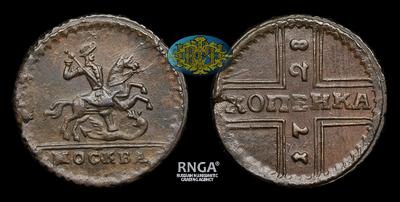 Аверс: Всадник меньше, откинувшийся назад, на вздыбленном коне. Шапка с полями большая. Копыта коня касаются земли. Двойная черта снизу. Буквы в «МОСКВА» малые.