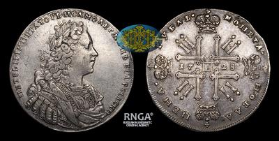 Аверс: Голова меньше, не разделяет круговую надпись. Венок с лентами. Лента на груди украшена пятью камнями и четырьмя жемчужинами. Орел на груди с коронами. Пять фестонов с звездами. Звезда ордена на груди. Ничего в начале и звезда в конце круговой надписи. Звезды разделяют круговую надпись. «ПЕТРЬ». «IМПЕРАТОРЬ». «Ц» в «САМОДЕРЖЕЦЪ» с коротким хвостиком.