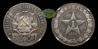 По нашему мнению, монета отчеканена по технологии PROOF. Об этом свидетельствуют рельеф и поверхность полей обеих сторон. Также следует заметить, что рубль 1922 года с данной разновидностью известен только в улучшенном исполнении. По официальной статистике компании NGC данный экземпляр единственный имеет оценку степени сохранности – MS63* PL.