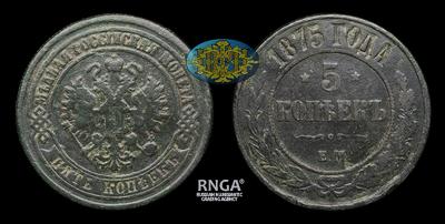 5 Копеек 1875 года, ЕМ. Тип 1867-1876 годов. Екатеринбургский монетный двор. Брак монетного двора