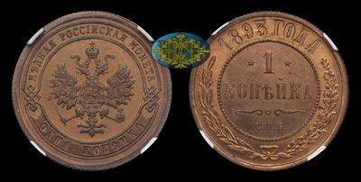 Копейка 1893 года, СПБ. Тип 1881-1894 годов. Санкт-Петербургский монетный двор