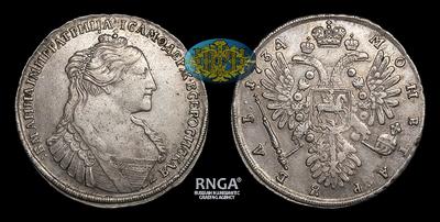 Аверс: Тип 1734-1737 годов, т.н. «Лошадиный профиль». Голова большая. Крест на короне простой, разделяет круговую надпись. Восемь жемчужин в прическе. Заклепки в нижнем ряду фестонов. Две ленты на левом плече. Двоеточие в начале и ничего в конце круговой надписи. Точки разделяют круговую надпись.