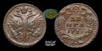 Денга 1731 года. Тип 1730-1731, 1734, 1735-1740 годов. Перечекан из Копейки 1704-1718 годов. Красный монетный двор