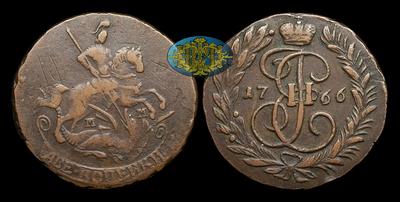 2 Копейки 1766 года, ММ. Тип 1763-1767 годов. Двойной перечекан из 2 Копеек 1757-1761 в 4 Копейки 1762 года. Красный монетный двор