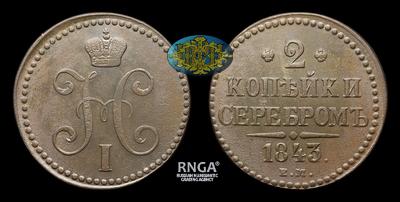 2 Копейки 1843 года, ЕМ. Тип 1840-1844 годов. Екатеринбургский монетный двор