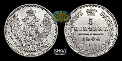 5 Копеек 1848 года, СПБ НI. Тип 1845-1850 годов. Санкт-Петербургский монетный двор