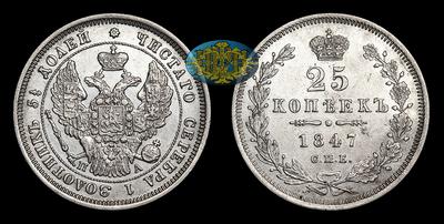 25 Копеек 1847 года, СПБ ПА. Тип 1844-1849 годов. Санкт-Петербургский