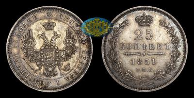 25 Копеек 1851 года, СПБ ПА. Тип 1848-1855 годов. Санкт-Петербургский монетный