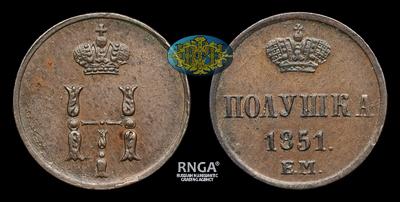 Полушка 1851 года, ЕМ. Тип 1849-1855 годов. Екатеринбургский монетный двор