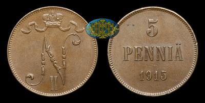 5 Пенни 1915 года. Тип 1896-1899, 1901, 1905-1908, 1910-1917 годов. Гельсингфорсский