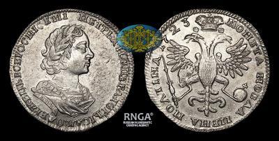 Аверс: Тип 1723-1725 годов, т.н. «Бюст в античном плаще». Точка над головой. Лента на груди ничем не украшена. Орел на груди с коронами. Пять двойных вертикальных полос на рукаве. Круговая надпись непрерывная. Точки разделяют круговую надпись. «ВСЕРОСИIСКИI».