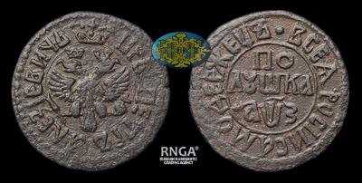 Центральная корона с крестом, украшенная жемчужинами, закрытая, большая, разделяет круговую надпись. Скипетр с трилистником, не касается крыла. Крест на державе простой, не касается крыла. «ПЕТРЪ». «АЛЕЗIЕВИЧЬ».