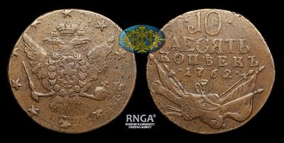 10 Копеек 1762 года. Тип 1762 года, т.н. "С военной арматурой". Перечекан из 5 Копеек 1758-1761 годов