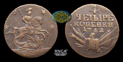 4 Копейки 1762 года. Тип 1761-1762 годов, т.н. "С военной арматурой". Перечекан из двух копеек 1757-1761 годов