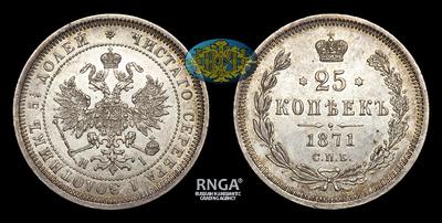 25 Копеек 1871 года, СПБ HI. Тип 1859-1881 годов. Санкт-Петербургский монетный двор