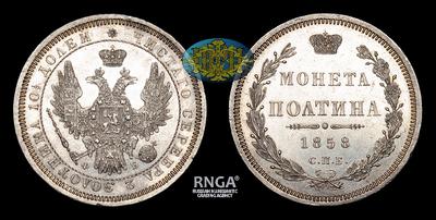 Полтина 1858 года, СПБ ФБ. Тип 1855-1858 годов. Санкт-Петербургский монетный двор