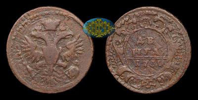 Денга 1730 года. Перечекан из копейки 1704-1718 годов. Красный монетный двор