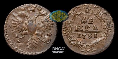 Денга 1731 года. Тип 1730-1731, 1734, 1735-1740 годов. Перечекан из копейки 1704-1718 годов. Красный монетный двор