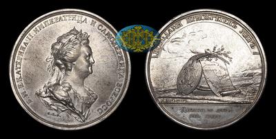 Крайне интересный, ранее не опубликованный экземпляр оригинальной медали 1791 года, отчеканенной по случаю подписания мирного договора с Турцией. Аверс медали описан. Реверс подобен ранее известному экземпляру, однако имеет небольшие отличия, а также иную подпись медальера справа над разделительной чертой. Такая же подпись «F.W.G.» имеется на малой медали, отчеканенной в честь этого же события. До настоящего времени медали с таким вариантом оборотной стороны известно не было.