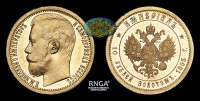 Первый год чеканки монет данного типа. Пробная чеканка Империалов, как и Руссов, появившихся в 1895 году, стало попыткой введения в денежное обращение монет нового типа (номиналов). Официальных данных об объеме чеканки не сохранилось, однако, учитывая их высокую оценку в дореволюционных каталогах и практическую встречаемость в современном нумизматическом обороте, можно сделать вывод, что их тираж был крайне малым. Для сравнения, Империал 1896 года, отчеканенный в количестве всего 125 экземпляров, встречается довольно регулярно. Какие-либо данные о дочеканке Империалов 1895 года в советский период, как это было, например, с 25 рублями 1896 года или с т.н. «Гангутскими» рублями 1914 года отсутствуют.