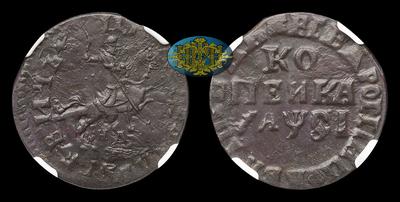 Реверс: Тип 1716 года (матричный). Украшенный четырехлистник сверху и без украшения снизу. «КОПЕИКА».Без украшений по сторонам «КО» в «КОПЕИКА». «РОССIИ».
