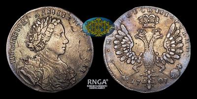 Реверс: Тип 1707 года. Центральная корона без креста, без украшений внутри, большая. Малые короны т.н. «императорские», без украшений внутри. Орел малый. Ости между перьев на крыльях орла. Без украшений по сторонам даты. Дата арабская.
