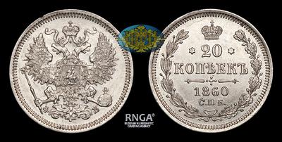 20 Копеек 1860 года, СПБ ФБ. Тип 1860-1866 годов. Санкт-Петербургский монетный двор
