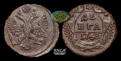 Денга 1748 года. Отчеканено на сумму 350 140 рублей. Екатеринбургский монетный двор