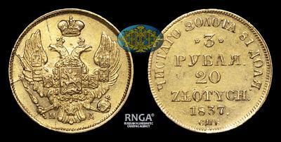 3 Рубля - 20 Злотых 1837 года, СПБ ПД. Тип 1834-1841 годов. Санкт-Петербургский монетный двор