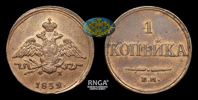 Копейка 1832 года, ЕМ ФХ. Тип 1830-1838 годов. Екатеринбургский монетный двор
