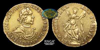 Крайне интересный экземпляр, особо выделен по степени редкости по всех каталогах и справочниках по русской нумизматике. В отличии от известных вариантов изображения Императора, встречающихся на монетах этого года, голова и бюст Петра имеют сильно уменьшенные размеры. В связи с чем выделяются как отдельный, редкий тип. Помимо редкости, обладает безупречным коллекционным происхождением. Следует заметить, что аналогичный экземпляр в подобной степени сохранности был продан на одном из швейцарских аукционов осенью 2019 года за 132 000 франков, что на дату проведения торгов приблизительно соответствовало 8 500 000 рублей.