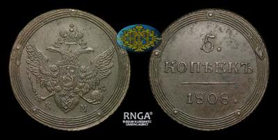 5 Копеек 1808 года, КМ. Тип 1802-1810 годов. Тираж 5 000 000 штук. Сузунский монетный двор