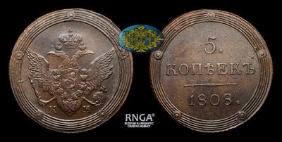 5 Копеек 1808 года, КМ. Тип 1802-1810 годов. Тираж 5 000 000 штук. Сузунский монетный двор